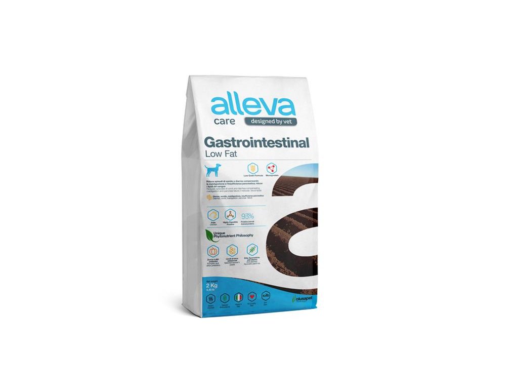 Alleva Care Gastrointestinal Low Fat je kompletné diétne krmivo pre psy každého veku na zníženie akútnych črevných porúch vstrebávania, na kompenzáciu tráviacich porúch a pri exokrinnej pankreatickej nedostatočnosti. Odporúča sa tiež ako podpora metabolizmu tukov v prípadoch hyperlipidémie.